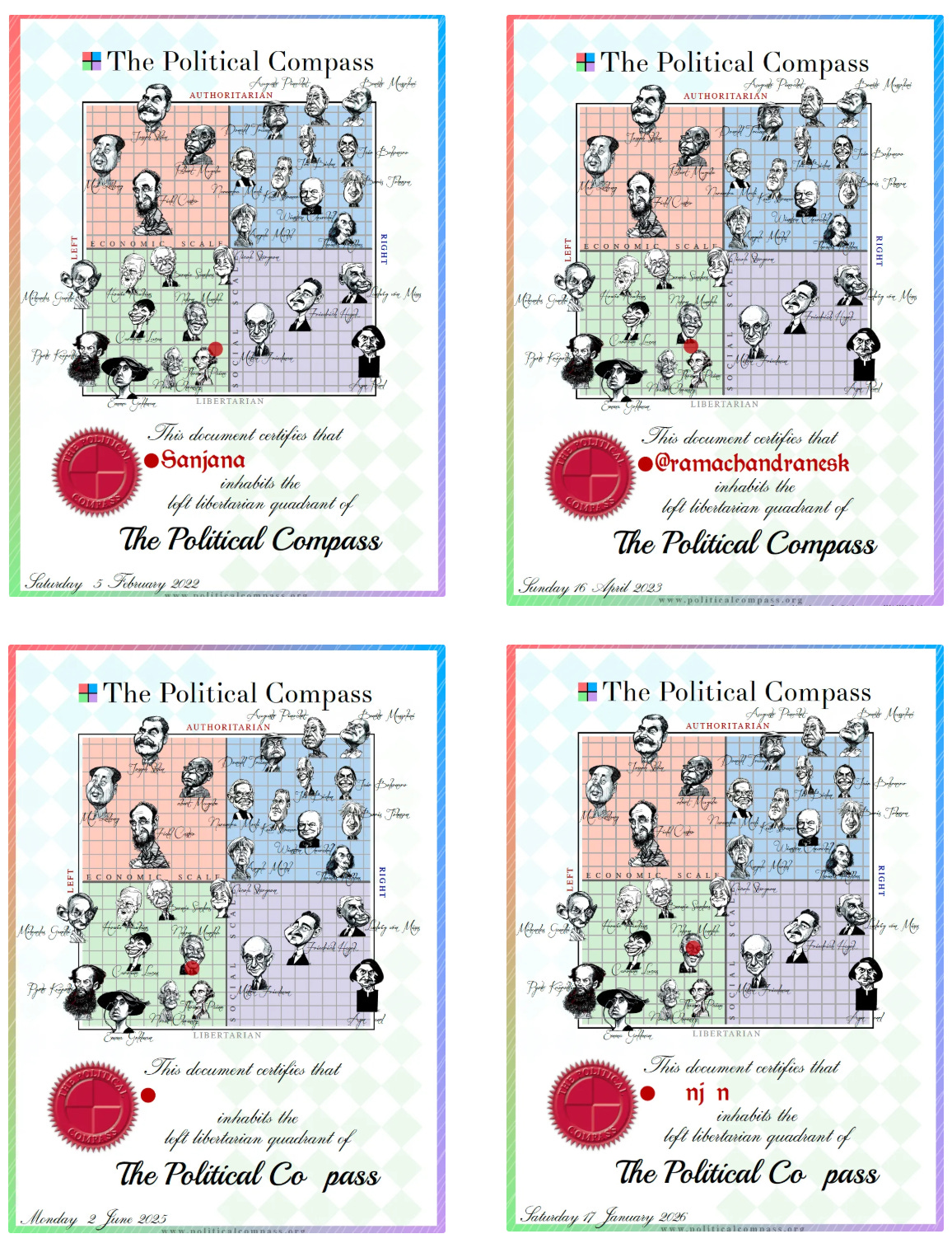 Upon AJ’s advice, I took the test over time to see how my views changed with the years. Four results from 2019 through 2026 indicate that I am, in fact, a “leftist liberal saali”! Left libertarian, to be exact.