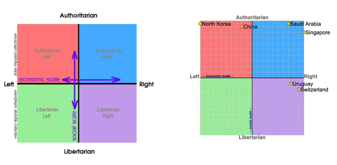 My thinking on this was first broadened in the company of some brilliant friends at B-school. AJ told me about the Political Compass test, which exposed to me the sloppiness behind just “left” and “right”. The site explains that these were meant to be used primarily on an economic axis—complete ‘left’ meaning a state-controlled economy, and complete ‘right’ meaning a total free market—whereas people also conflate them with a social axis—‘left’ meaning total social freedom, ‘right’ meaning authoritarianism—and so, put together, you have a 2x2 matrix for where you stand politically. You can’t be only “left” or “right”, you could be left-left, left-right, right-left, right-right. See below.
